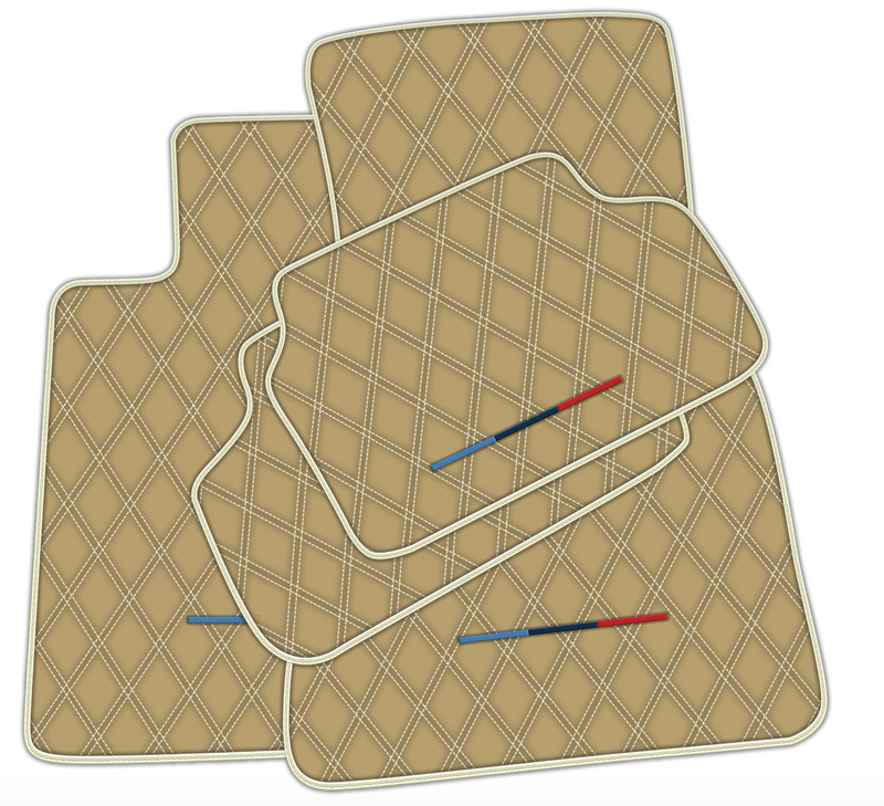 Enhance the look of your BMW with these Beige Leather Floor Mats. Featuring a Double Diamond Pattern with white stitching and white trim, these mats will add a touch of sophistication to your vehicle. Made from high-quality leather, these mats are durable and easy to clean.