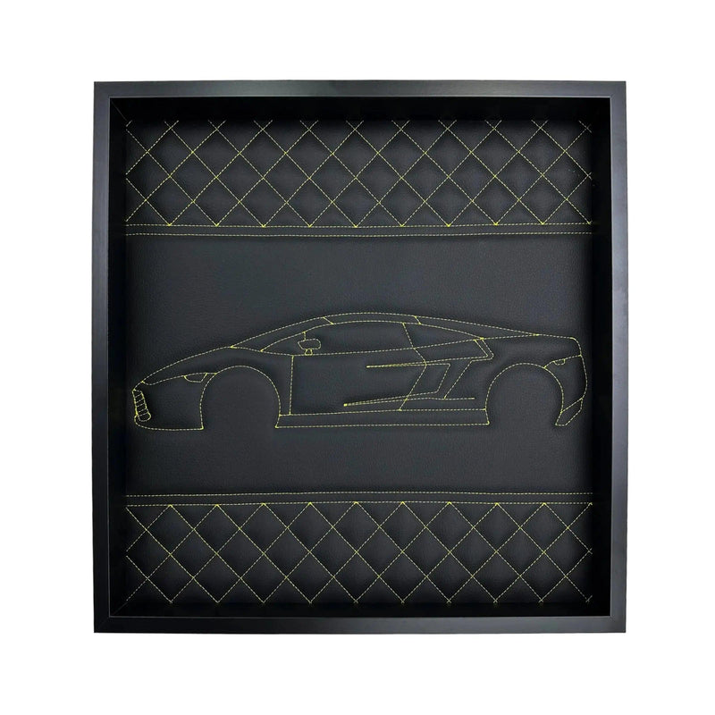 Black Leather Lamborghini Gallardo Inspired Wall Art: Embroidered Yellow Stitch Luxury Decor