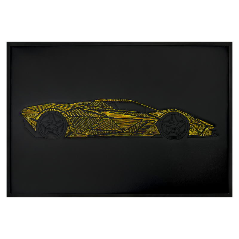 Black Leather Supercar Inspired Wall Art: Embroidered Yellow Stitch