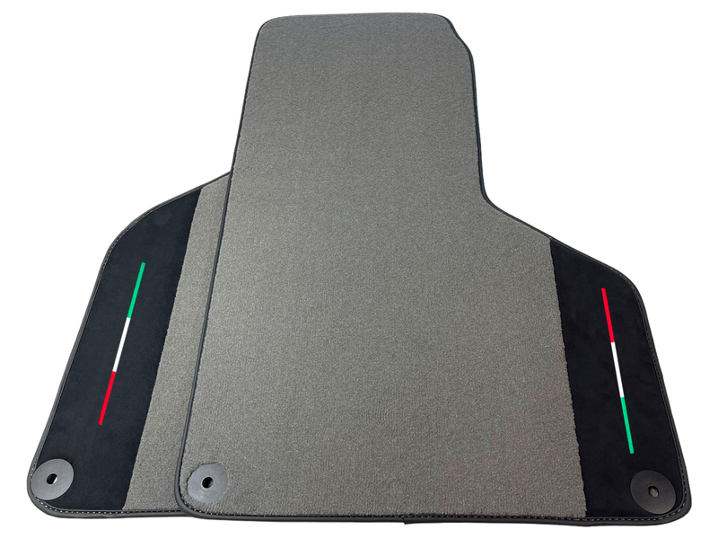 Upgrade your Lamborghini Huracan with these luxurious gray floor mats with Italian flag, made with high-quality Alcantara leather. Enhance the overall look and feel of your car with this custom-fit accessory. Protect your car's floors from wear and tear while adding a touch of elegance to your interior. Expertly designed for a perfect fit and long-lasting durability.