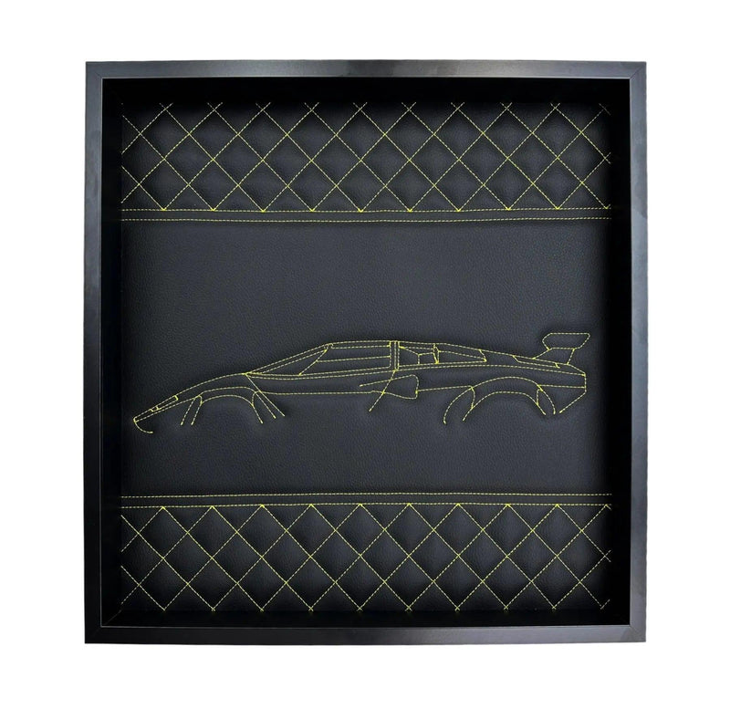 Black Leather Lamborghini Countach Inspired Wall Art: Embroidered Yellow Stitch Luxury Decor