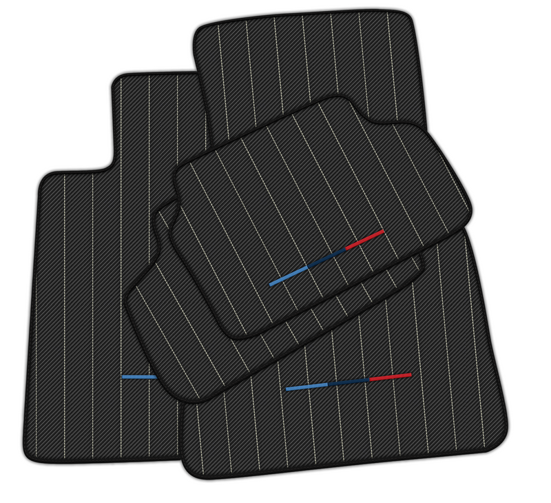 The Black Carbon Fiber Floor Mats for BMW provide a sleek and stylish upgrade to your car's interior. Crafted with high-quality carbon fiber and featuring a line pattern and white stitching, these mats not only look great but also offer durability and protection for your car's floors. With the added detail of the iconic m tricolor, these mats will elevate the look of your.