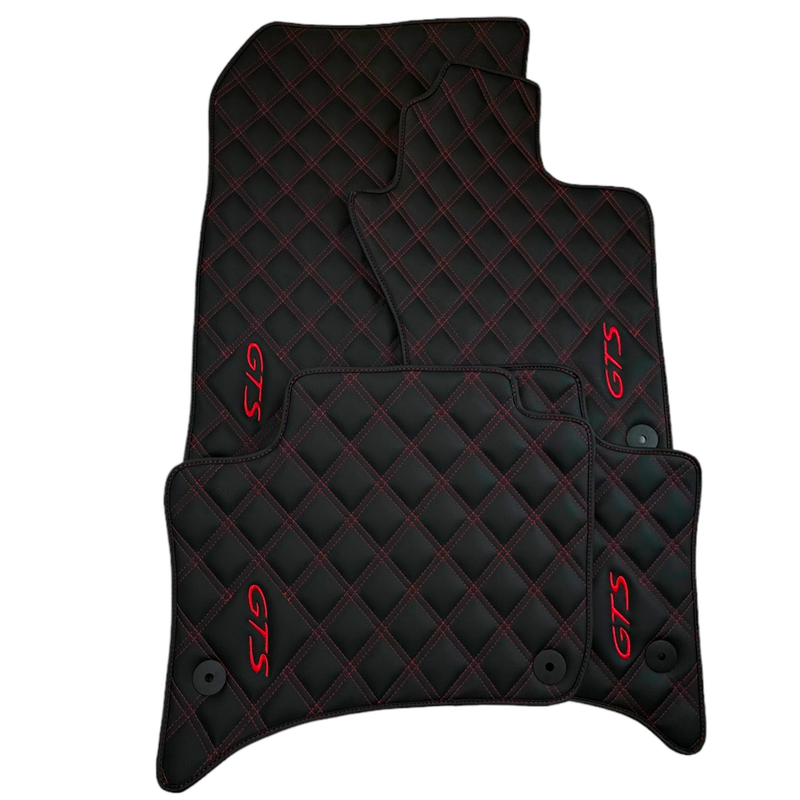 Expertly crafted for Porsche Cayenne GTS (2010-2018), these leather floor mats with red stitching provide durability and style. These custom-fit mats add a touch of luxury to your car's interior while protecting it from dirt and wear. Upgrade your driving experience with these high-quality floor mats.